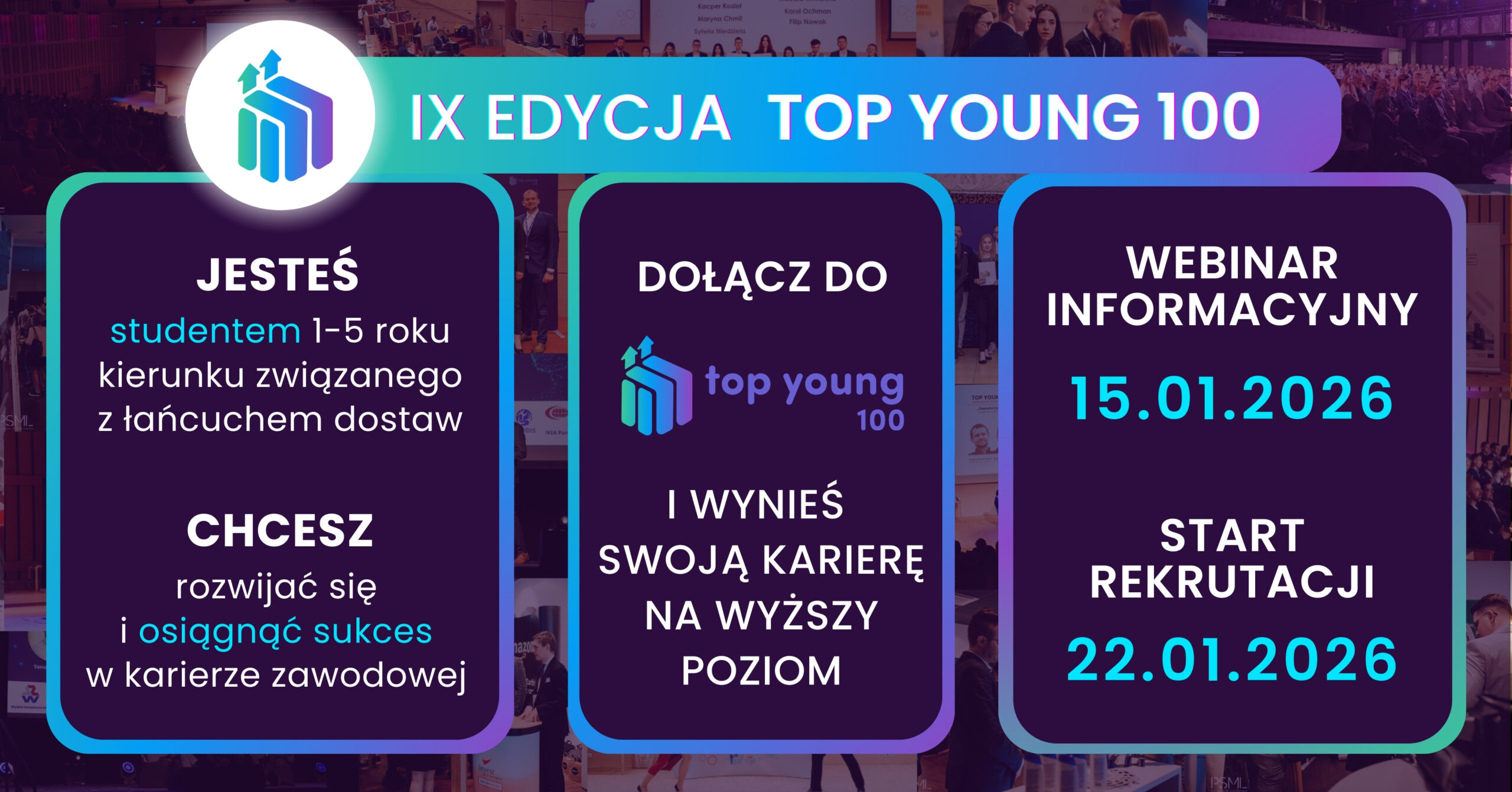 Nie odkładaj decyzji – być może to właśnie Top Young 100 będzie punktem zwrotnym w Twojej karierze! Już ponad 600 studentów takich jak TY stało się absolwentami Top Young 100, tworząc nową jakość na rynku pracy i uzyskując realną przewagę konkurencyjną!