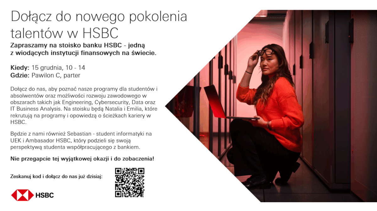 Dołącz do HSBC, aby poznać programy dla studentów i absolwentów oraz możliwości rozwoju zawodowego w obszarach takich jak Engineering, Cybersecurity, Data oraz IT Business Analysis. Na stoisku będą Natalia i Emilia, które rekrutują na programy i opowiedzą o ścieżkach kariery w HSBC.